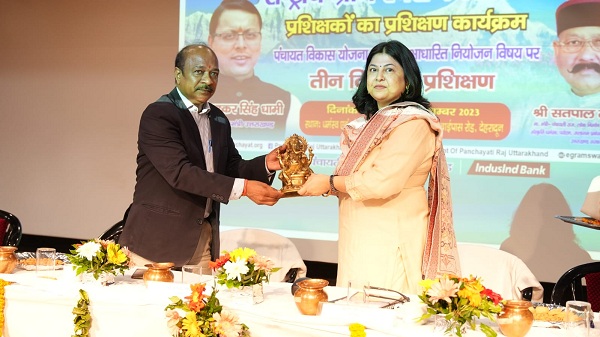 पंचायत विकास योजना एवं थीम आधारित नियोजन विषय पर गैर सरकारी संगठनों के प्रशिक्षकों का राज्य स्तरीय तीन दिवसीय प्रशिक्षण (TOT) कार्यक्रम का आयोजन आज 18 नवंबर 2023 से पंचायत विकास योजना एवं थीम आधारित नियोजन विषय पर गैर सरकारी संगठनों के प्रशिक्षकों का राज्य स्तरीय तीन दिवसीय प्रशिक्षण (TOT) कार्यक्रम के द्वितीय बैच का आयोजन धर्मस्व एवं संस्कृति विभाग प्रेक्षागृह, हरिद्वार बाई पास रोड, देहरादून में प्रारंभ हुआ । सत्र के प्रथम सत्र में सचिव, पंचायती राज हरीचन्द सेमवाल का स्वागत निदेशक पंचायती राज निधि यादव ने पुष्पगुच्छ और स्मृतिचिन्ह देकर किया । दीप प्रज्वलन के उपरांत निदेशक निधि यादव ने प्रतिभागियों को संबोधित करते हुए पंचायती राज व्यवस्था के परंपरागत स्वरूप और भारतीय समाज में समाहित मूल्यों को वेदों की ऋचाओं से, उपनिषदों में स्वीकृत सामाजिक व्यवस्था और मुगलकाल और ब्रिटिश राज के कालखंड में शासकीय व्यवस्था क्रमिक विकास विषय पर विस्तृत प्रकाश डाला और वर्तमान में भारत सरकार द्वारा 9 थीम के स्थानीयकरण में पंचायतों की भूमिका निर्वहन द्वारा प्रत्येक ग्रामीण नागरिक को सामाजिक न्याय और आर्थिक विकास के संवैधानिक मानकों की पूर्ति करने की आवश्यकता बताई ।