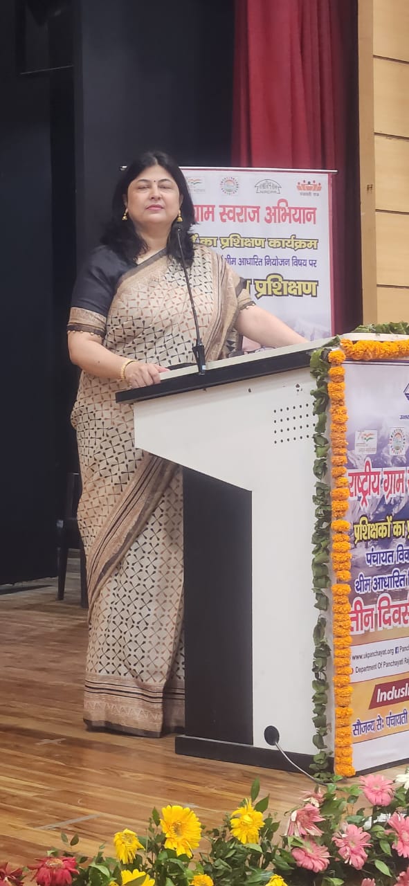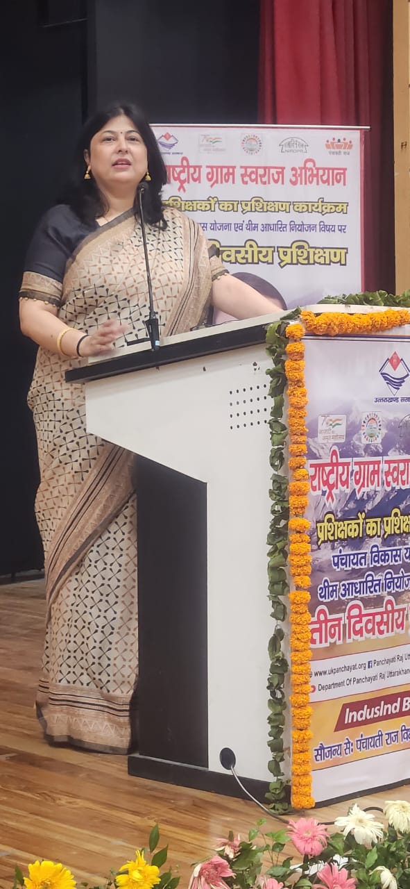 पूनम पाठक ने पंचायत विकास सूचकांक विषय पर चर्चा करते हुए बताया कि यह विषय पंचायतों का विकास मापने का एक यंत्र है जिसके द्वारा ग्राम पंचायतें स्वयं के विकास का ऑनलाइन मूल्यांकन कर सकते हैं। शिवा व्रतकर राष्ट्रीय प्रशिक्षण विशेषज्ञ ने थीम 1 गरीबी मुक्त एवं उन्नत आजीविका विषय पर व्याख्यान दिया। गीता कांडपाल, विशेषज्ञ, जल जीवन मिशन ने थीम 4 जल पर्याप्त गांव विषय पर पंचायों द्वारा जल प्रबंधन और जल संचयन सहित शुद्ध पेयजल की आवश्यकता हेतु विभिन्न प्रक्रिया के संबंध में चर्चा किया । दिनेश गंगवार स्टेट प्रोजेक्ट मैनेजर, पंचायती राज निदेशालय, देहरादून ने ई गवर्नेस विषय पर प्रतिभागियों को प्रशिक्षित किया जिसके अंतर्गत PDI, वाइब्रेंट ग्राम सभा, जीपीडीपी पोर्टल सहित अन्य ऑनलाइन प्लेटफार्म्स के विषय में विस्तृत परिचर्चा की । तीन दिवसीय प्रशिक्षण के पहले दिन 235 प्रतिभागियों ने प्रतिभाग किया ।
