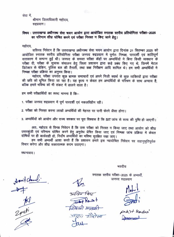 इन परीक्षार्थियों ने अपने ज्ञापन में निवेदन किया है कि उत्तराखण्ड अधीनस्थ सेवा चयन आयोग द्वारा दिनांक 21 सितम्बर 2025 को आयोजित स्नातक स्तरीय प्रतियोगिता परीक्षा जनपद रुद्रप्रयाग में पूर्णतः निष्पक्ष, पारदर्शी एवं शांतिपूर्ण वातावरण में सम्पन्न हुई थी। जनपद के समस्त परीक्षा केंद्रों पर अभ्यर्थियों ने बिना किसी व्यवधान के परीक्षा दी, परीक्षा के सुचारू संचालन हेतु जिला प्रशासन द्वारा कड़े प्रबंध किए गए थे, जिनमें मेटल डिटेक्टर से चेकिंग, पुलिस बल की तैनाती, तथा कक्ष निरीक्षण आदि शामिल थे। हम सभी अभ्यर्थियों ने निष्पक्ष परीक्षा प्रक्रिया का अनुभव किया।