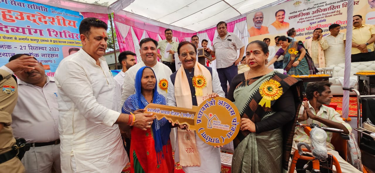कार्यक्रम में सांसद डॉ. रमेश पोखरियाल निशंक ने कुल 160 दिव्यांगजनों को 218 सहायक उपकरण, कुल मूल्य लगभग 45.00 लाख का वितरण किया गया। ग्राम्य विकास विभाग की ध्वजवाहक योजना प्रधानमंत्री आवास योजना (ग्रामीण) के अंतर्गत आवासविहीन परिवारों को आवास की चाबी वितरित करने के साथ – साथ महिला बाल विकास विभाग की ओर से महिलाओं को मुख्यमंत्री महालक्ष्मी किट योजना के अंतर्गत महालक्ष्मी किट भी प्रदान किये गये। सांसद डॉ. रमेश पोखरियाल निशंक ने उत्तराखण्ड पेयजल निगम, रुड़की द्वारा जल जीवन मिशन योजनान्तर्गत 07 योजनाओं, मनरेगा कार्यक्रम के अंतर्गत 05 अमृत सरोवरों, सांसद विकास निधि से निर्मित कुल 06 कार्यों व राज्य वित्त आयोग / केन्द्रीय वित्त आयोग द्वारा पोषित 05 योजनाओं, कुल मूल्य 153.62 लाख का लोकार्पण भी किया गया । कार्यक्रम में राष्ट्रीय ग्रामीण आजीविका मिशन के अंतर्गत 05 स्वयं सहायता समूहों को कुल मूल्य रु० 30.00 लाख के ऋण का वितरण भी किया गया ।