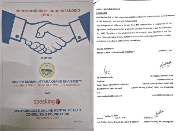 टिहरी : श्रीदेव सुमन उत्तराखंड विश्वविद्यालय, बादशाहीथौल, टिहरी गढ़वाल और स्पीकिंगक्यूब ऑनलाइन मेंटल हेल्थ कंसल्टिंग फाउंडेशन के बीच एक महत्वपूर्ण समझौता ज्ञापन (एमओयू) पर दिनांक 21 अगस्त 2025 को हस्ताक्षर किए गए। इस समझौते का उद्देश्य छात्रों और समाज में मानसिक स्वास्थ्य जागरूकता, शैक्षणिक शोध, और सामाजिक उद्यमिता को नई दिशा देना है।