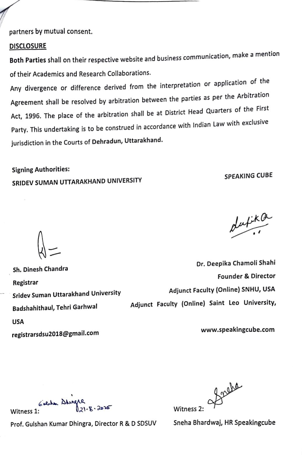 विश्वविद्यालय के कुलपति प्रोफेसर एनके जोशी द्वारा बताया गया कि विश्वविद्यालय के अनुसंधान एवं विकास प्रकोष्ठ द्वारा पिछले दो वर्षों में लगभग 25 अंतरराष्ट्रीय व राष्ट्रीय संस्थानों से (MOU) समझौता हस्ताक्षर किए गए हैं व इसी क्रम में विगत मार्च 2025 में स्पीकिंगक्यूब संस्था के सहयोग से विश्वविद्यालय द्वारा वर्चुअल माध्यम से मनोवैज्ञानिक मुद्दे: हस्तक्षेप और प्रबंधन विषय पर एक अंतरराष्ट्रीय सम्मेलन आयोजित किया गया। उन्होंने बताया कि आने वाले सितंबर 2025 से विश्वविद्यालय व स्पीकिंगक्यूब संस्था द्वारा एक फैकेल्टी डेवलपमेंट कार्यक्रम का आयोजन किया जा रहा है जिसका प्रदेश व देश के प्राध्यापकों को लाभ प्रदान होगा।