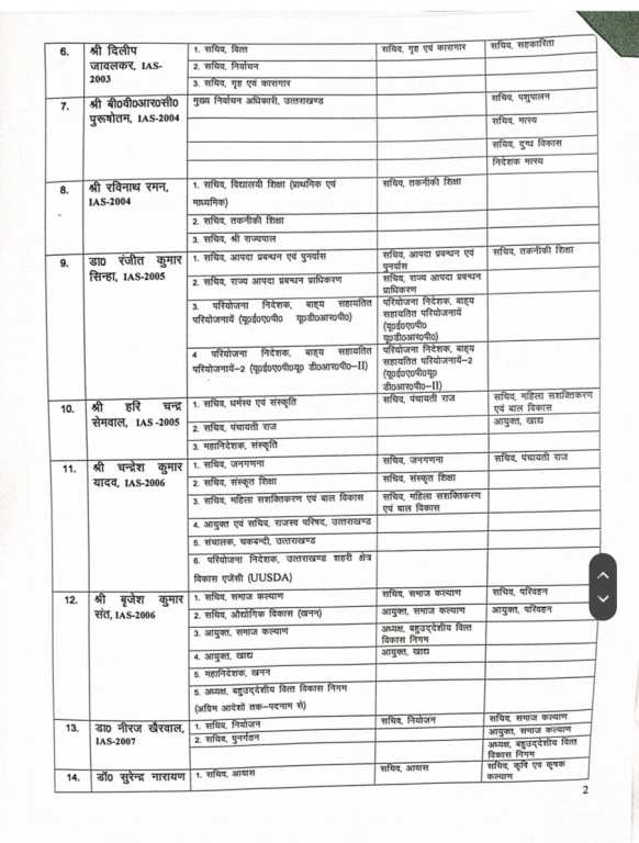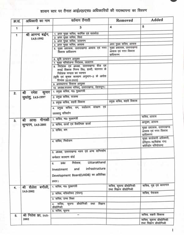 देहरादून : शासन से बड़ी खबर है। सीएम धामी के निर्देश के बाद 15 IAS अधिकारियों के तबादले किए गए हैं। साथ ही एक IFS और एक ITS अधिकारी का भी तबादला किया गया है।