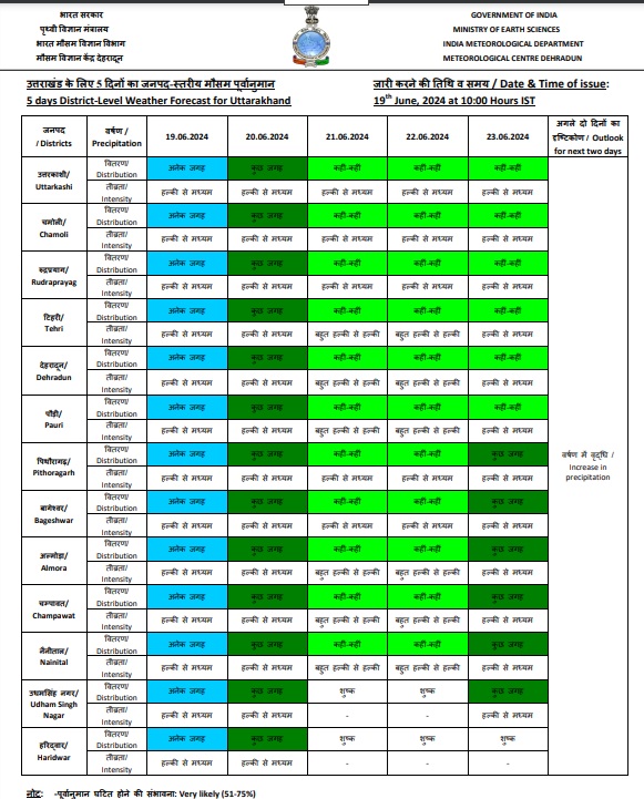 इस बीच मौसम विभाग ने अगले पांच दिनों के लिए अलर्ट जारी किया है। इसके अनुसार राज्य के सभी जिलों में बारिश हो सकती है। खासकर आज 19 जून के लिए ऑरेंज अलर्ट जारी किया गया है। हालांकि, अब तक मैदानी जिलों में बारिश के आसार कम ही नजर आ रहे हैं।