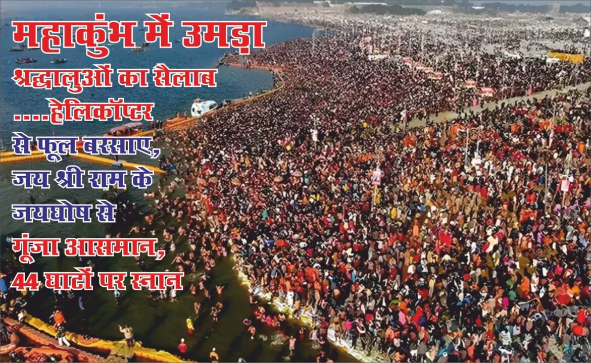 प्रयागराज : भव्य महाकुंभ 2025 आस्था, भक्ति और आध्यात्मिक एकता के जबरदस्त प्रदर्शन के साथ सोमवार को शुरू हुआ है। जिसने आज 144 वर्षों में एक बार देखी गई आध्यात्मिक भव्यता की याद ताजा कर दी। यहां देश और दुनिया भर से भक्तों का एक समूह न केवल जप, ध्यान और आध्यात्मिक तृप्ति के लिए एकत्र हुआ, बल्कि महाकुंभ की बेजोड़ सांस्कृतिक विरासत का अनुभव करने के लिए भी एकत्र हुआ। पौष पूर्णिमा पर सोमवार को पहला स्नान हुआ। दोपहर 4 बजे तक 44 घाटों पर डेढ़ करोड़ श्रद्धालु डुबकी लगा चुके हैं। भक्तों पर हेलिकॉटर से 20 क्विंटल फूलों की वर्षा की गई। महाकुंभ 144 साल में दुर्लभ खगोलीय संयोग में हो रहा है।