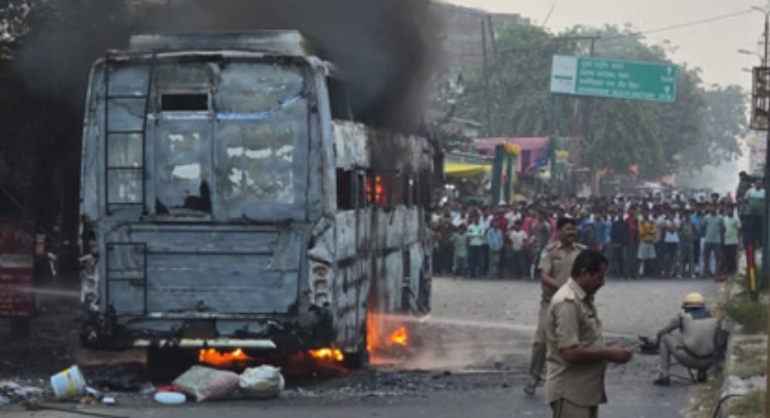 लखीमपुर खीरी: मैगलगंज कस्बे के मुख्य चौराहे पर बुधवार सुबह उस समय हड़कंप मच गया, जब दिल्ली से सीतापुर जा रही एक डग्गामार स्लीपर बस में अचानक आग लग गई। देखते ही देखते बस आग का गोला बन गई। बस में सवार करीब 100 यात्रियों में से कई ने खिड़कियों और दरवाजों से कूदकर अपनी जान बचाई। स्थानीय लोगों की त्वरित मदद से सभी यात्रियों को सुरक्षित निकाल लिया गया, लेकिन उनका सारा सामान जलकर राख हो गया।